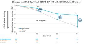 ADAS-Cog13 difference −12.78 (P < 0.0001) with oral blarcamesine treatment compared to ADNI control group at Week 144